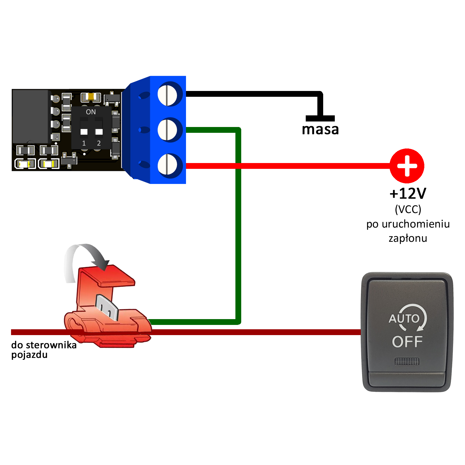 - zacisk VCC do +12V pojawiającego się po uruchomieniu silnika,